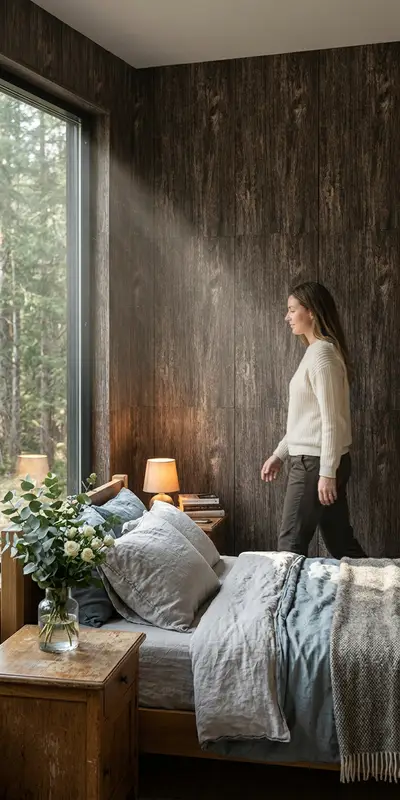 Гибкая доска для спальни: деревянное изголовье и акцентная стена. Уют натурального дерева.