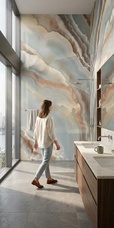 Купить гибкий мрамор для ванной комнаты. Влагостойкий, лёгкий монтаж, натуральный вид мрамора. Доставка по РФ.